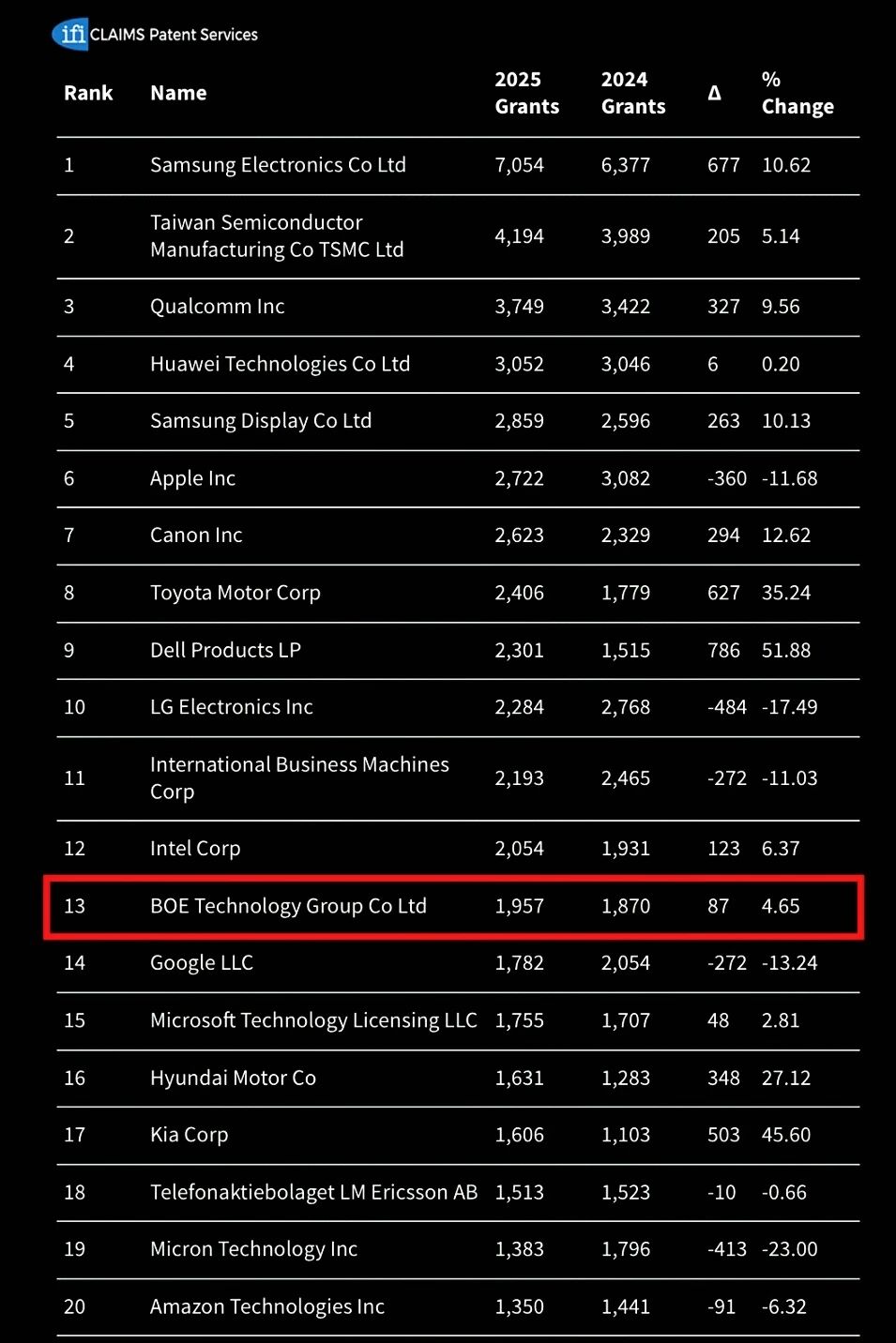 2026年1月13日,全球权威专利服务机构IFI Claims发布2025年度统计报告,BOE(京东方)位列美国专利授权排行榜全球第13位,连续第8年稳居全球TOP20阵营,成为TOP20中唯一一家中国显示企业。